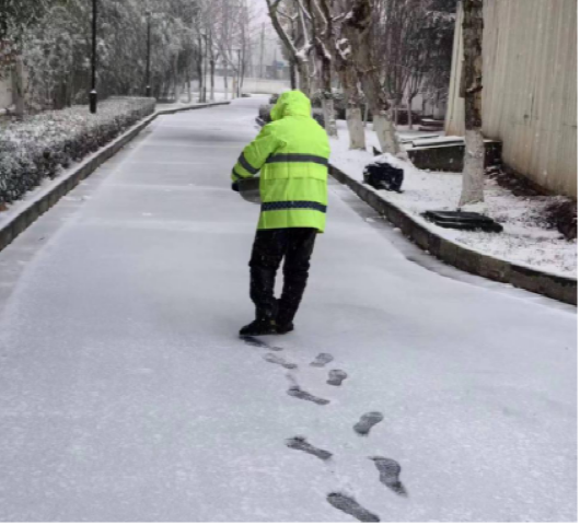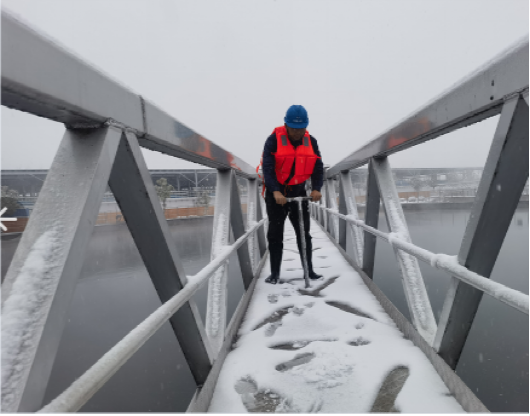 以“雪”為令,行動在前。建立應急保障三級梯隊,各生產廠區“以‘雪’為令”,堅持“即下即清”的原則,及時清理巡視路線、辦公區域、平流池積雪并鋪設防滑墊,放置融雪劑、除冰鏟,切實保障職工人身安全。污水處理廠的管道系統在低溫下容易結冰,為防止設備在低溫下出現故障,對所有污水處理設備進行保溫處理,用保溫材料包裹水泵、電機等關鍵設備,以減少熱量散失。