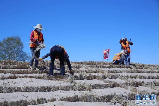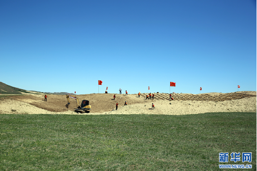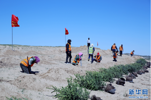 5月15日,工人在克什克騰旗境內(nèi)的渾善達(dá)克沙地南緣扎沙障、種苗木。新華網(wǎng)石毅 攝